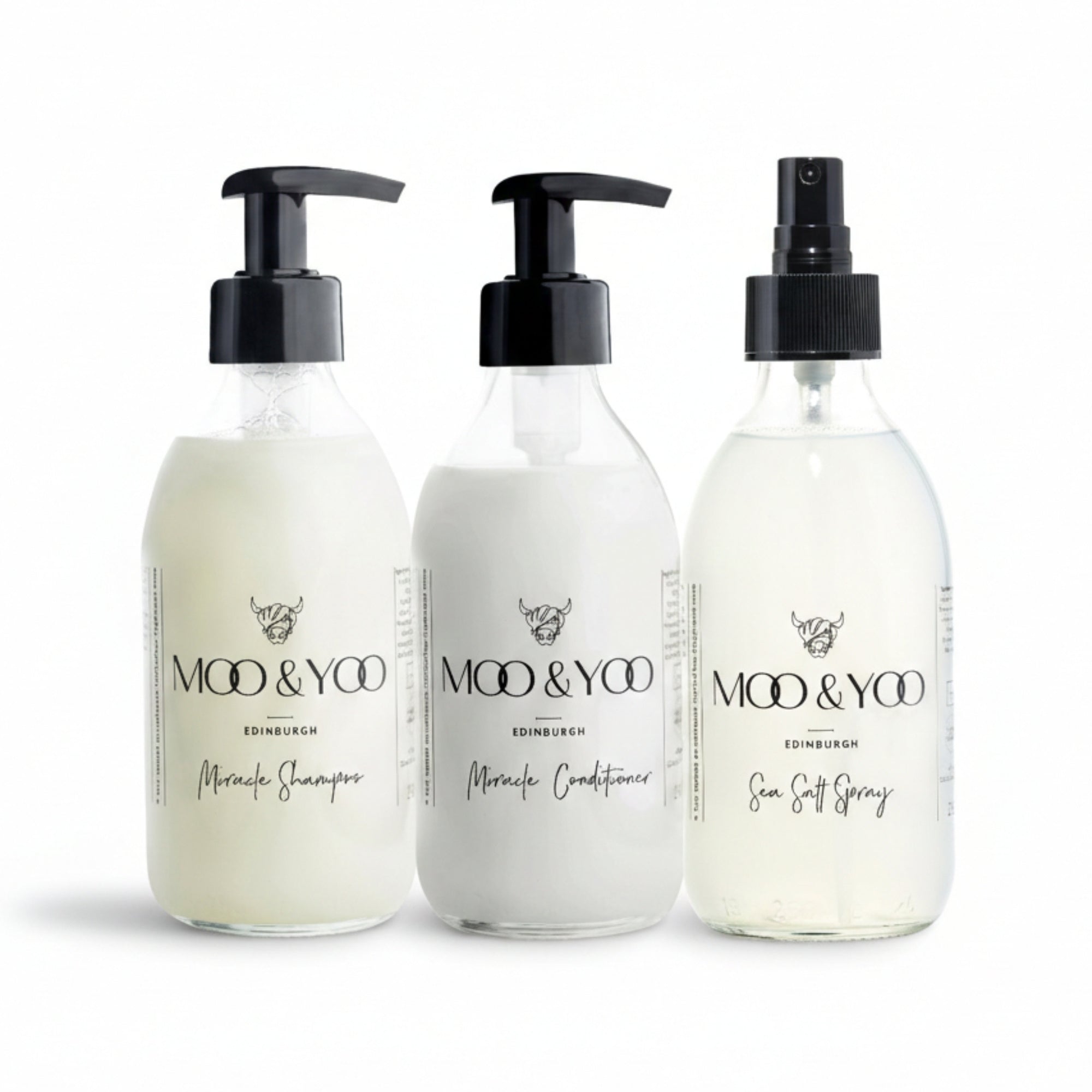 This luxury vegan bundle contains our Miracle Shampoo (250ml), Miracle Conditioner (250ml) and our Sea Salt Spray (250ml).
